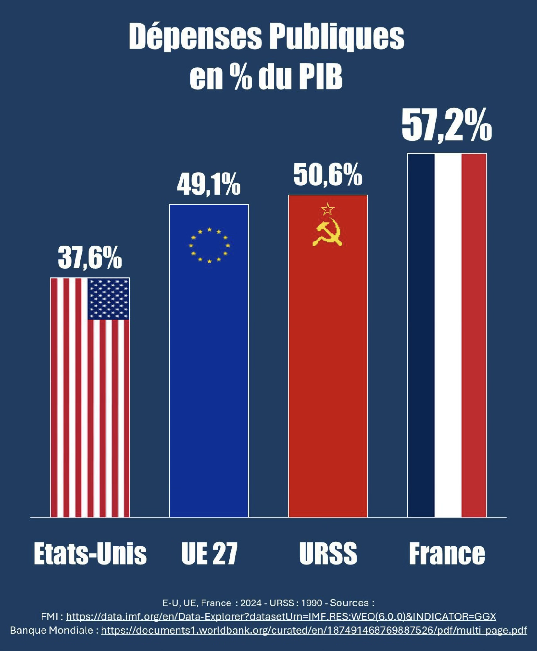 En réalité, le communisme s’est imposé en France, non par une révolution mais par la strangulation du social-étatisme, l’étau de l’éducation nationale et des médias infiltrés puis contrôlés par les gauchistes. Les enfant sont formatés dès le primaire. Les étudiants le sont jusqu’aux études supérieures pour beaucoup d’entre eux, dans des filières sans débouché autre qu’un emploi public ou un système de Ponzi circulaire comme la sociologie où la seule perspective est de devenir prof de sociologie ou sociologue militant sponsorisé par nos impots. Le pire, c’est que beaucoup d’électeurs n’ont pas réalisé qu’ils vivent sous un régime social communiste au point que, comble de l’ironie, il existe même un parti anti-capitaliste en France. Avec 57% du PIB consacré à la dépense publique et des impôts et taxes qui totalisent 46% du PIB, la France est devenue championne du monde de la taxation tout en accroissant inexorablement sa dette. Même l’URSS des années 90 ne dépensait pas autant en proportion du PIB, elle était à 50%.